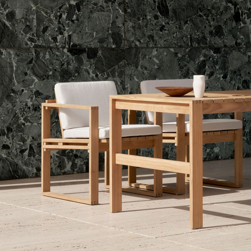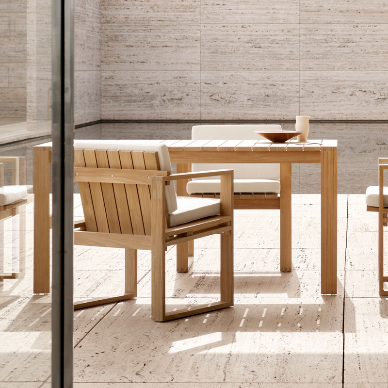 BK15 spisebord fra Carl Hansen & Søn er designet av Bodil Kjær i 1959. Bordet er laget i ubehandlet FSC-sertifisert teak og har et stramt, arkitektonisk formspråk. Den solide konstruksjonen gjør det egnet for uterom, og treverket utvikler en vakker patina over tid.