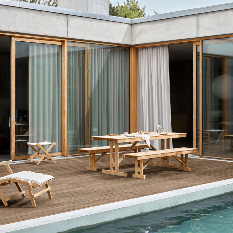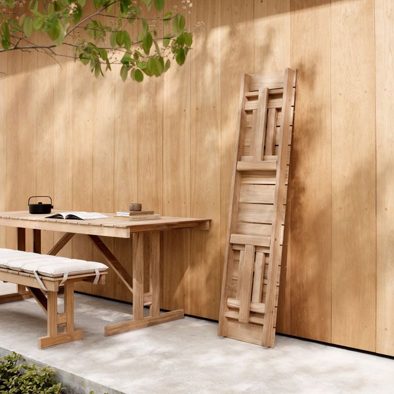 BM1771 spisebord fra Carl Hansen er designet av Børge Mogensen i 1971. Bordet er laget i ubehandlet FSC‑sertifisert teak med et renskåret, funksjonelt uttrykk. Det solide og sammenleggbare designet gjør det til et praktisk og tidløst møbel til uteplassen.