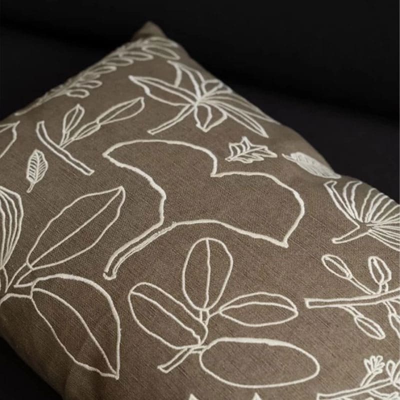 Bregne putetrekk fra Fine Little Day er en utrolig skjønn pute med brodert print av botaniske blader. Laget av 70% lin og 30% ubleket lerret med glidelås (pute uten innmat).