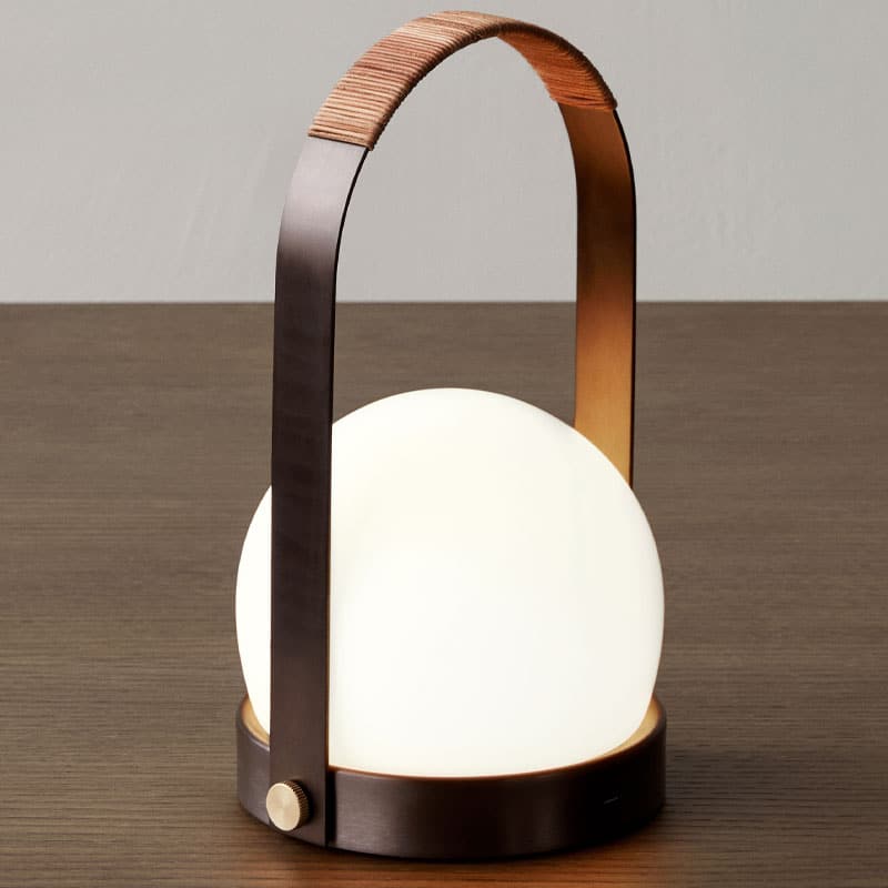 Carrie-bordlampen, bærbar, er laget av munnblåst opalglass og er tilgjengelig i en rekke farger og materialer.