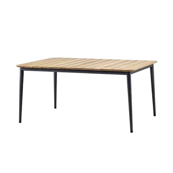 Core spisebord fra Cane-line er designet av Foersom & Hiort-Lorenzen MDD. Bordet kombinerer en solid aluminiumsramme med en bordplate i teak. Materialkontrasten gir et moderne og stilrent uttrykk, samtidig som teak er svært godt egnet til utendørs bruk.