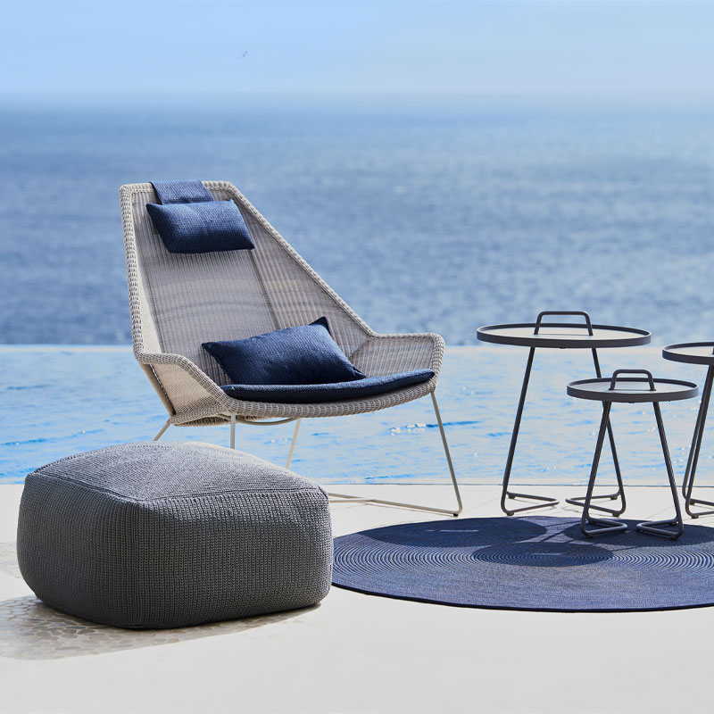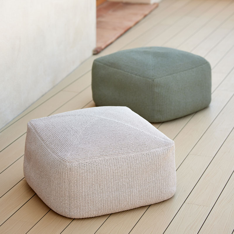Velg mellom fotskammelen i Cane-line Rise-stoff – 55 x 55 x 40 cm, eller den håndklæde varianten i Cane-line Divine-materiale – 60 x 60 x 35 cm.