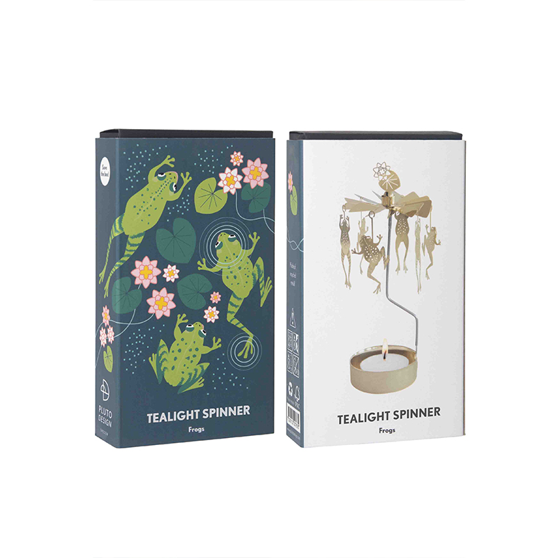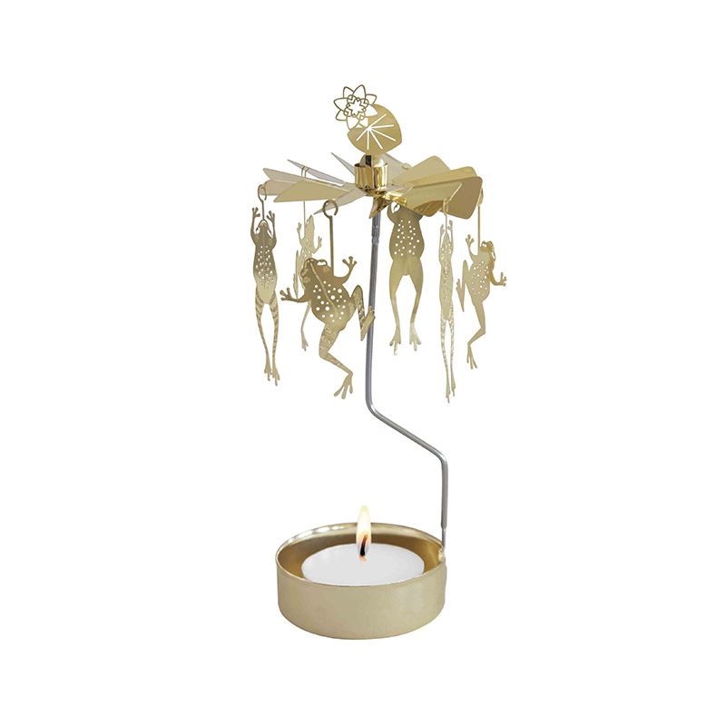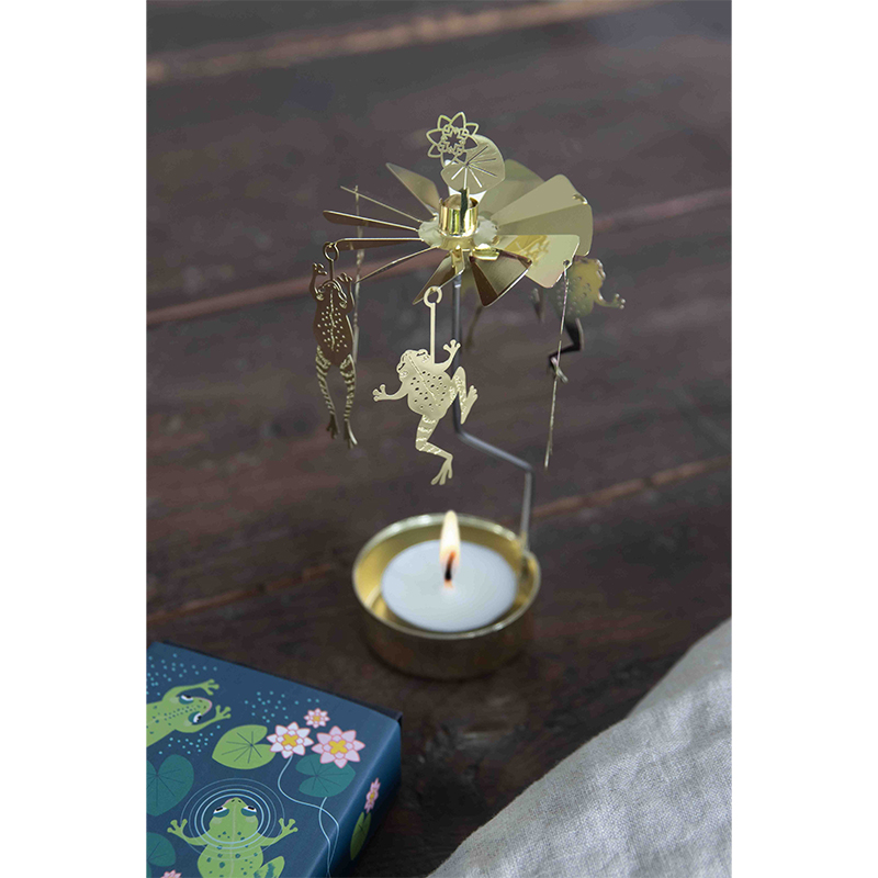 Englespill Frosk fra Pluto Design i gullbelagt stål snurrer majestetisk rundt med frosker som «danser» rundt lyset. Englespillet passer perfekt som en ekstra dekorasjon og er en vakker interiørdetalj.