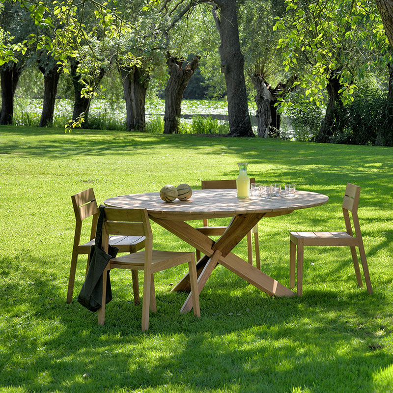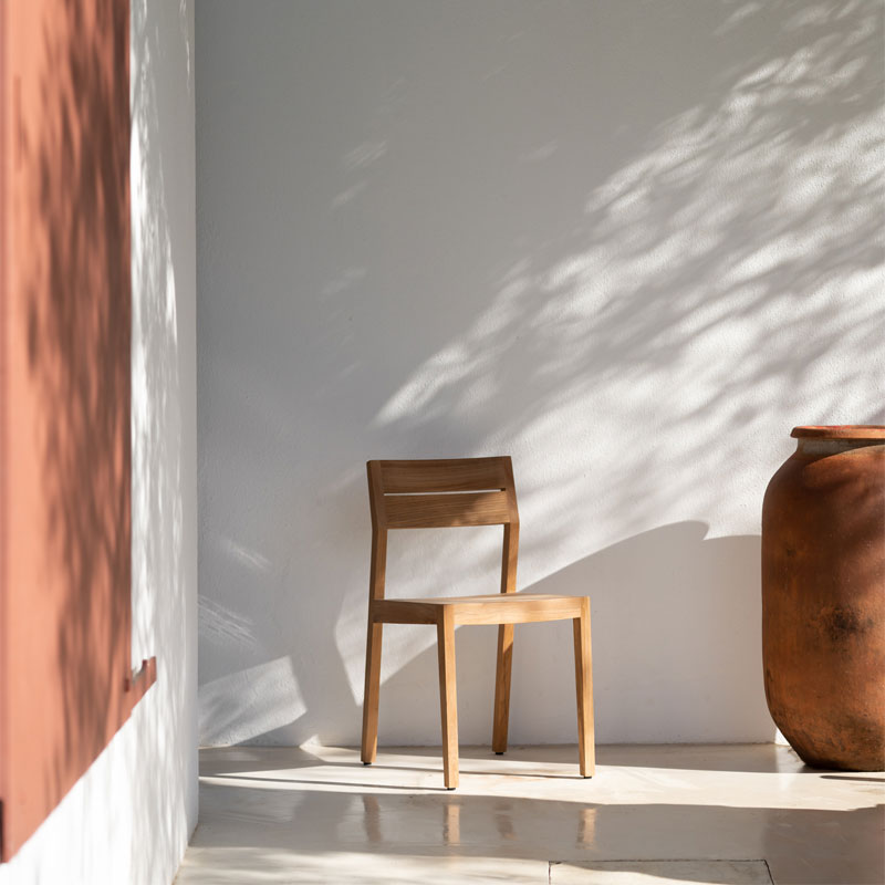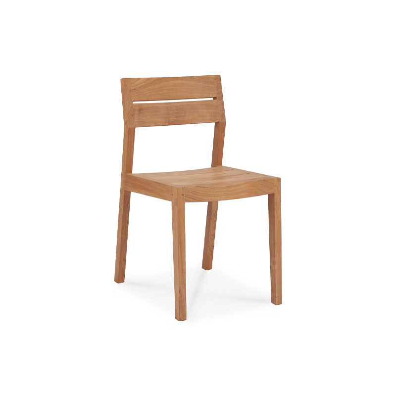 EX1 spisestol fra Ethnicraft er en tidløs utestol i massiv teak med et enkelt og stilrent uttrykk. Den solide konstruksjonen gir god stabilitet, mens det naturlige materialet eldes vakkert over tid og utvikler en sølvgrå patina.