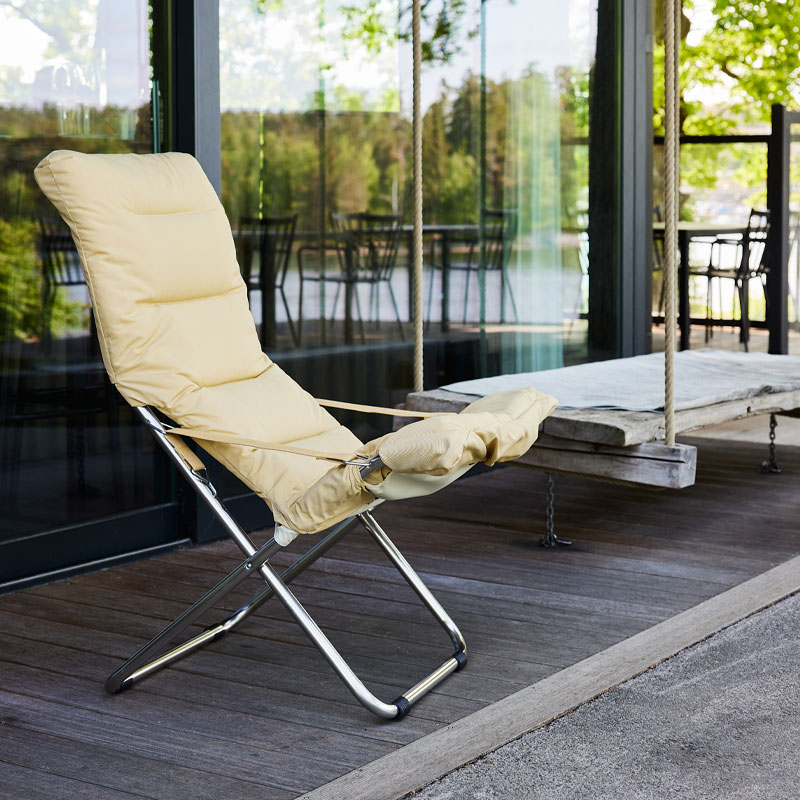 Stolen kan ikke brukes uten pute. Stolen kan enkelt reguleres i fire posisjoner og kan slås sammen når du ikke trenger den.