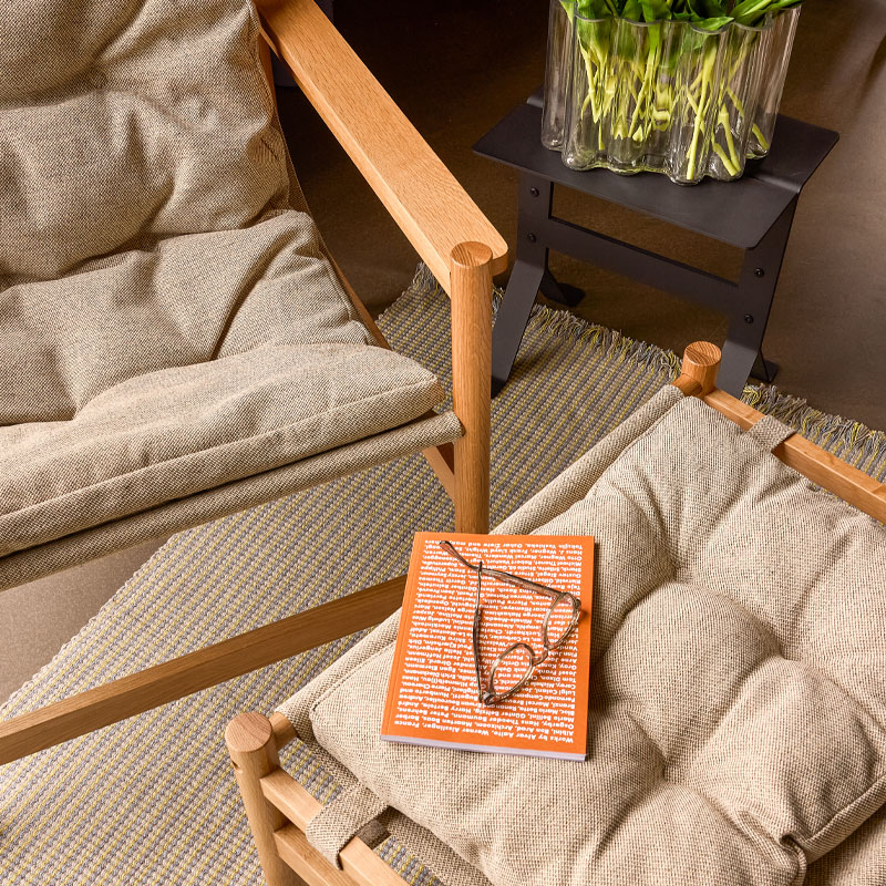 Heritage lenestol med fotskammel fra Hübsch i naturfarge med beige tekstil kombinerer tidløs eleganse og komfort. Len deg tilbake i en ramme av lyst tre, med myk polstring og nøytrale toner som passer i mange interiørstiler.