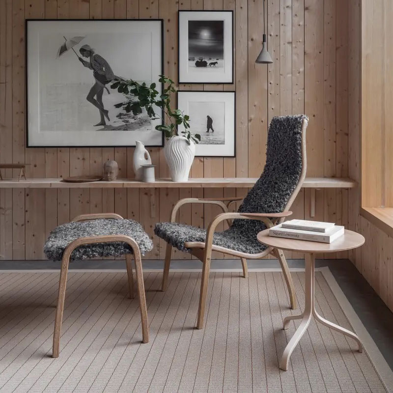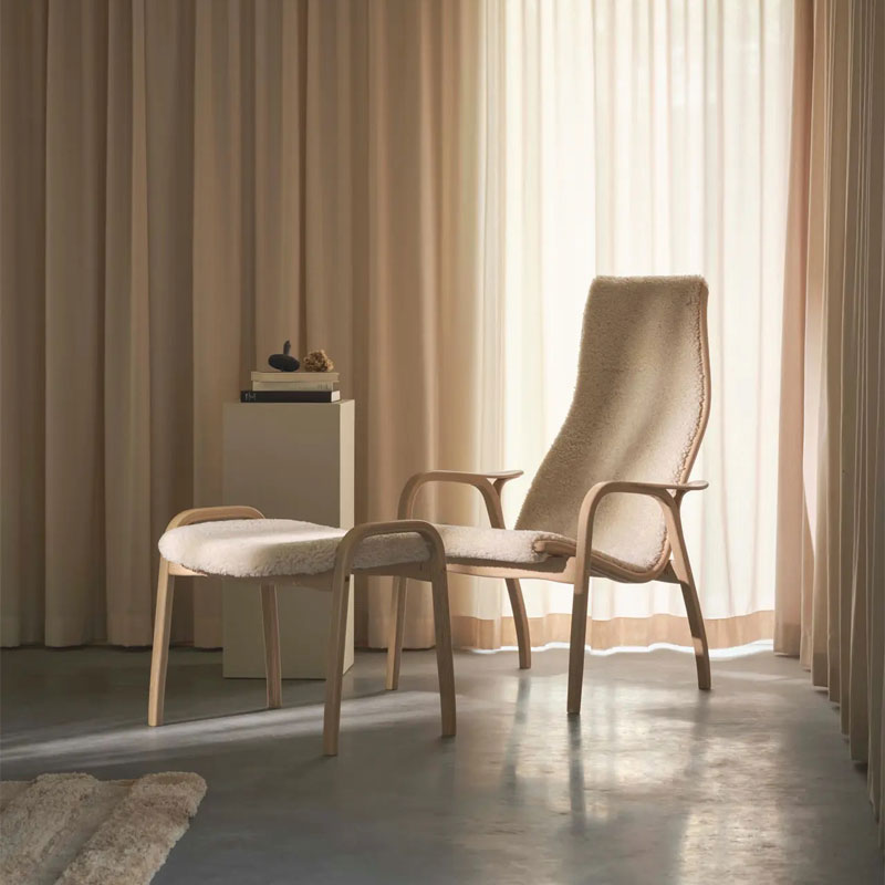 Lamino lenestol med fotskammel fra Swedese er et ikonisk møbelsett designet av Yngve Ekström i 1956. Med formpresset tre, myk saueskinnspolstring og ergonomiske linjer forener det tidløs skandinavisk design, høy komfort og førsteklasses håndverk