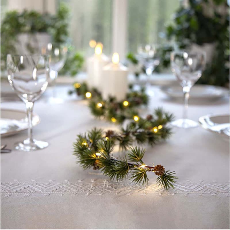 Larix Girlander med lys – en stilfull LED-girlander drevet av batteri med innebygd timer. Den måler ca. 140 cm i lengde og er utstyrt med LED-lys (20 × 0,6 W) som gir et dekorativt og varmt lys. Perfekt til å pynte opp i vinduer, på bordet eller i hylla.