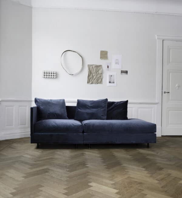 Lun modulsofa fra Ygg & Lyng er utviklet for å ta minst mulig plass, uten at det går på bekostning av komforten. Smale armlener og rygg utnytter sitteflaten optimalt og gir rom for store, myke seteputer i dun.