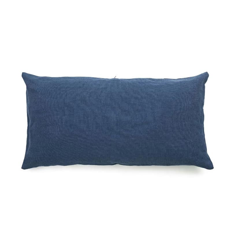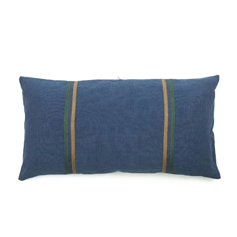 Max indigo pute fra belgiske Libeco er laget i 100 % lin og leveres med dunpute inkludert. Den blå basen kombinert med striper i grønt og oker gir et levende og harmonisk uttrykk.