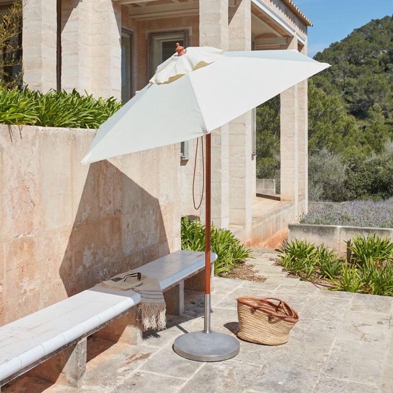 Messina parasoll fra Fritz Hansen kombinerer tidløst design med slitesterke materialer. Den er laget i FSC-sertifisert kapurtre med teflonbehandlet tekstil som avviser vann og smuss, og gir effektiv solbeskyttelse gjennom hele sommeren.