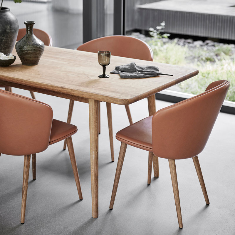 Dark brown, cognac eller black rygg og sete – Ben i oljet eller hvitoljet eik.