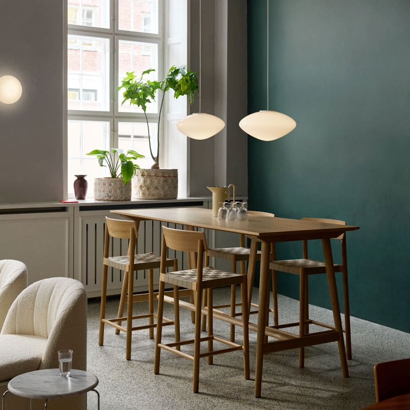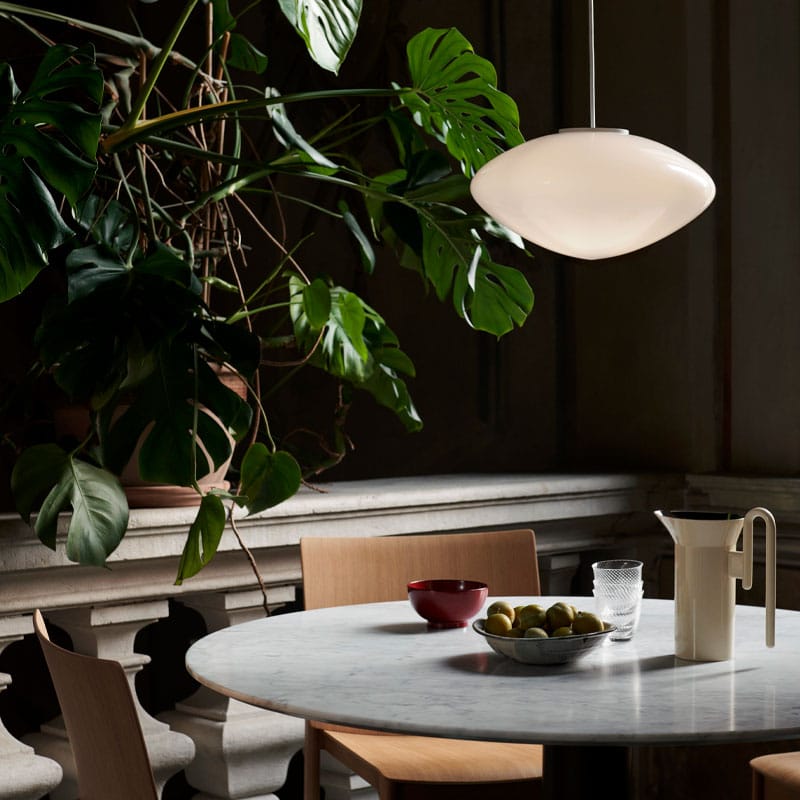 Mist AP16 Taklampe er en elegant pendel i munnblåst opalglass som gir et varmt, diffust lys uten blending. Den hvite, runde formen skaper en myk og harmonisk atmosfære i rommet, og passer perfekt alene eller i gruppe over spisebord, kjøkkenøy eller i stua.