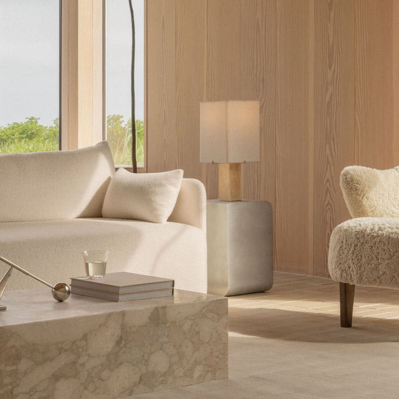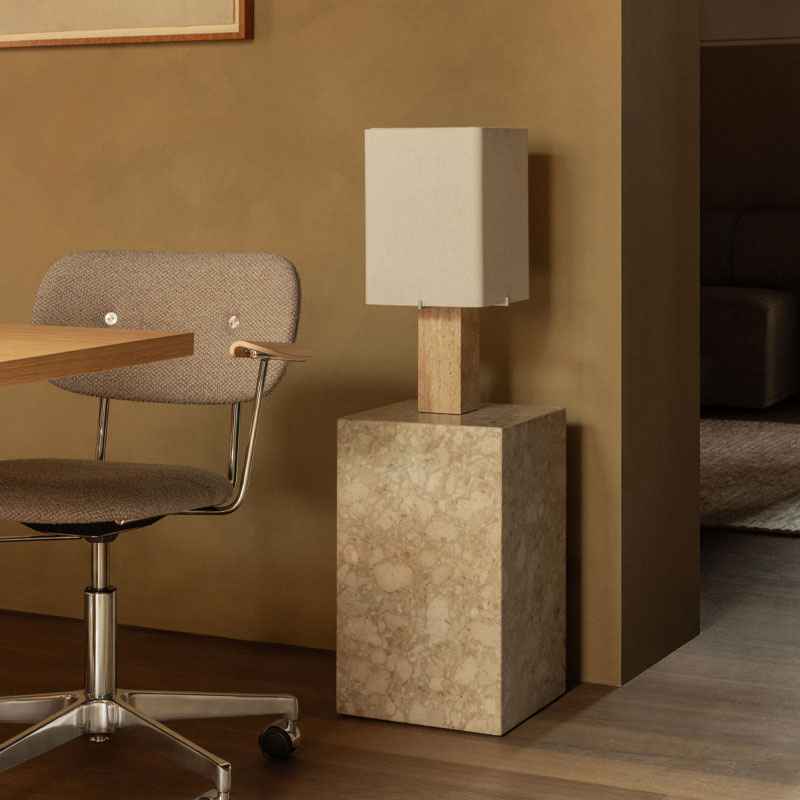Nonna Bordlampe Travertine er en tidløs bordlampe med base i travertinstein og en elegant skjerm i lin og akryl som gir et varmt, dempet lys. Den kombinerer naturlige materialer med nordisk design, og passer perfekt på nattbordet, i stuen eller på hyllen for et sofistikert, rolig uttrykk.