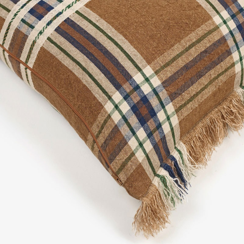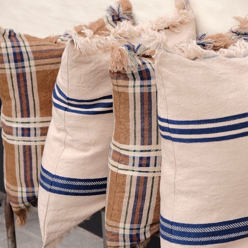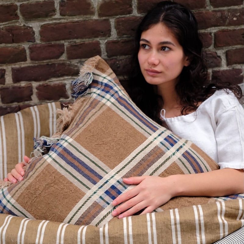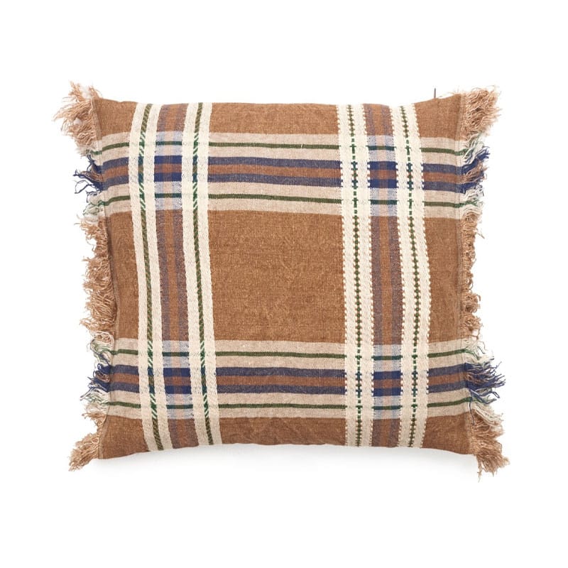 Batsi Check Pute fra belgiske Libeco er laget i 100 % lin og leveres med dunpute inkludert. En rutete pute med siennabrun base og ruter i blått og off-white.