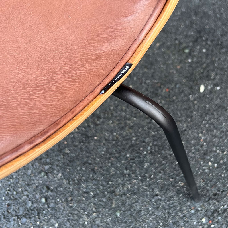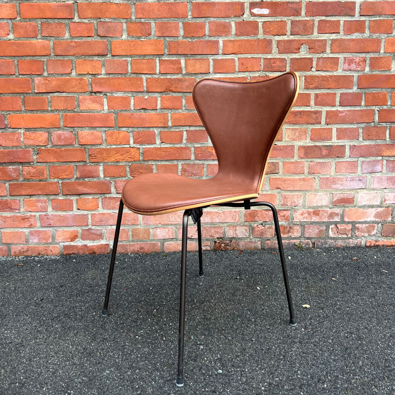 Serie 7 frontpolsteret skinn | Utstillingsmodell fra Fritz Hansen, designet av Arne Jacobsen er essensen av dansk design. Rene linjer, tidløse former og håndverk av høy kvalitet – nå og i generasjoner fremover. Stolen selges fra utstilling med redusert pris. Noen bruksmerker på ben, ellers god stand.