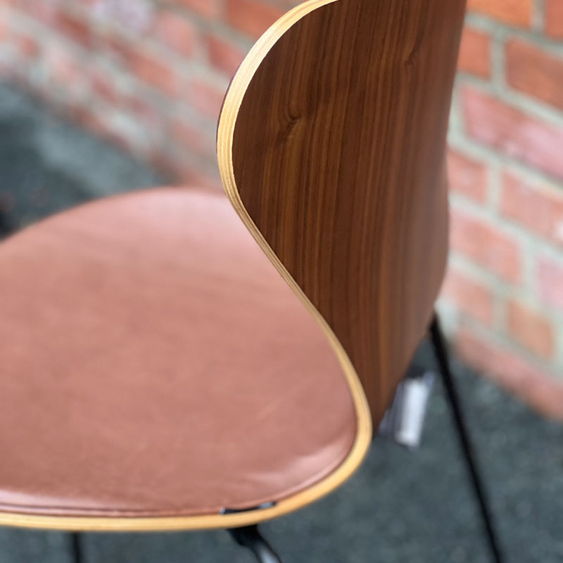 Valnøtt skall i finer med rygg/sete polstring i brunt skinn. Brose/brune metallben.