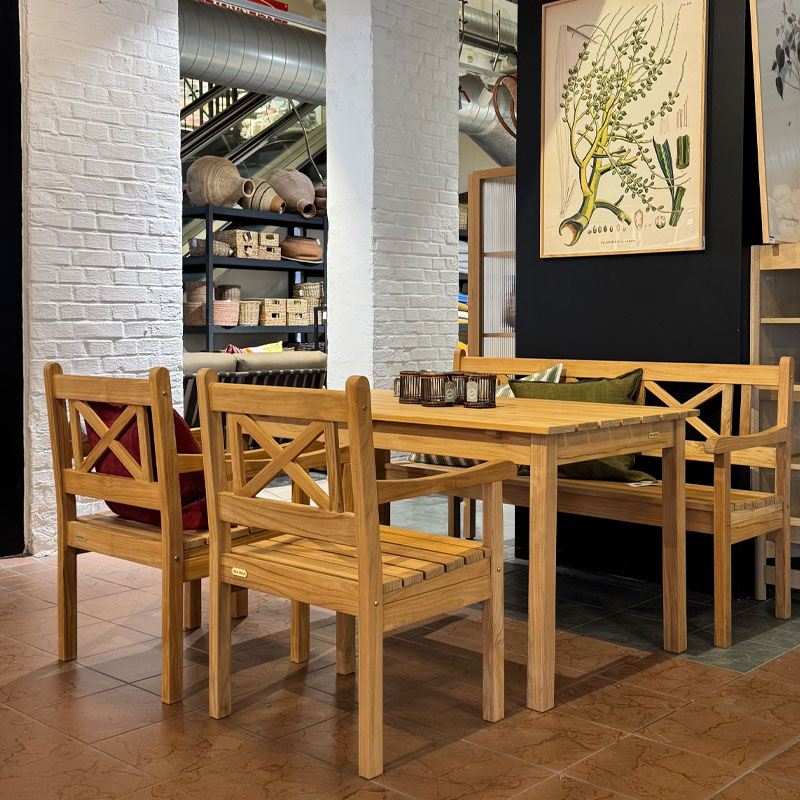 Skagen Sett fra Fritz Hansen er en samling utendørsmøbler designet for å bringe skandinavisk eleganse og funksjonalitet til hager og terrasser. Inspirert av Danmarks nordligste punkt, Skagen, kombinerer denne serien tradisjonell design med moderne design. Settet inneholder bord, benk og 2 stoler. Utstilling selges med 20% rabatt.