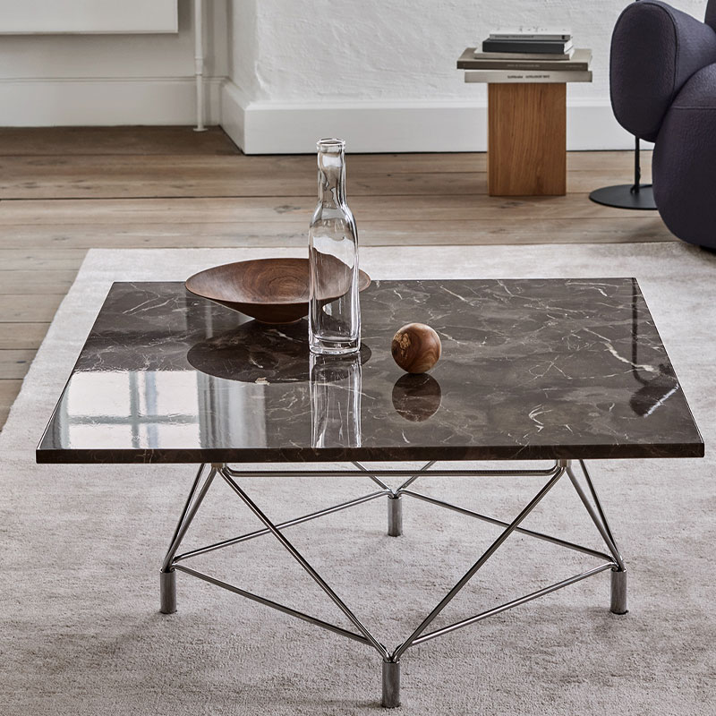 Spider sofabord | Kvadratisk fra Eilersen. Spider-bordene er designet av Andreas Hansen i tett samarbeid med Eilersen, og kjennetegnes av et grafisk understell med et nesten spindelvev lignende uttrykk. Bordene kan leveres med bordplate i ulike marmortyper eller glass, slik at du kan skape et uttrykk som passer perfekt til ditt hjem.