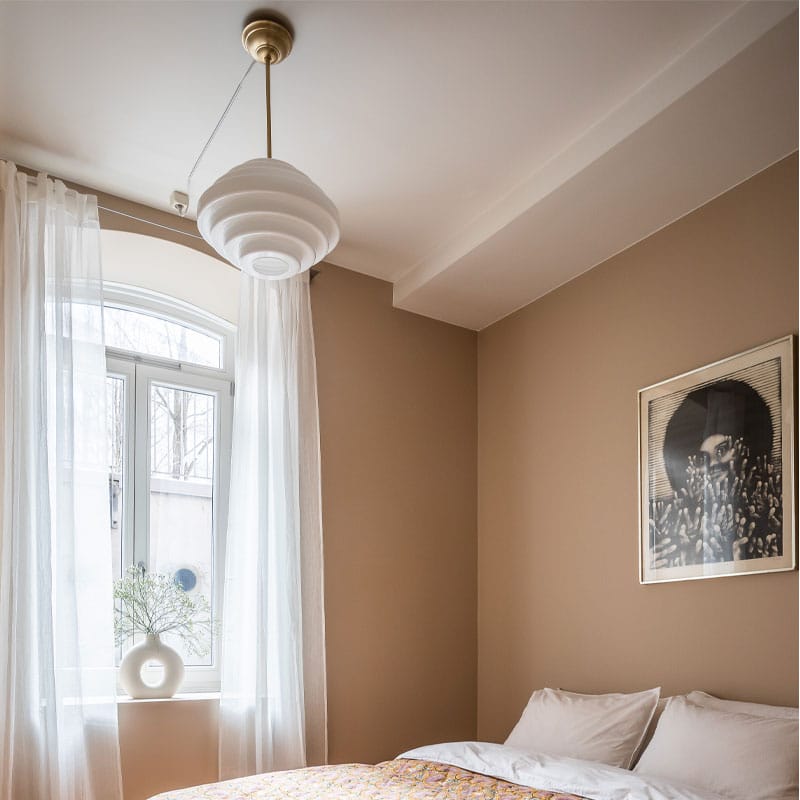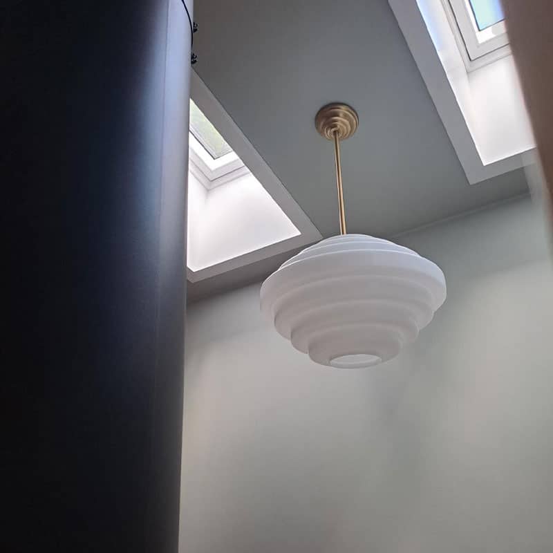 Step by Step taklampe fra House of Holmedal er inspirert av art deco og kombinerer stramme linjer med et tidløst og moderne uttrykk. Den store størrelsen gjør seg perfekt i stua eller over spisebordet, og den solide messingstangen gir stabilitet og et klassisk preg som passer både i moderne og tradisjonelle hjem.