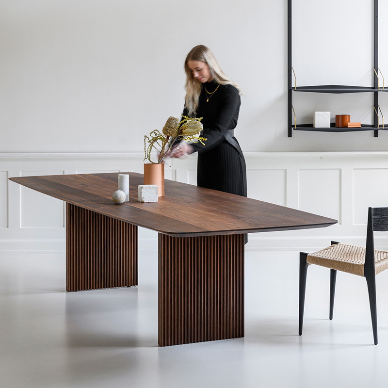 Ten Table spisebord ble designet i forbindelse med 10-årsjubileet til dk3 i 2019, og er laget i solid eik eller valnøtt. Til tross for massive materialer og dets dimensjoner, har Ten Table en netthet som fremheves av de vakre vertikale detaljene i understellet og den organisk formede bordplaten.