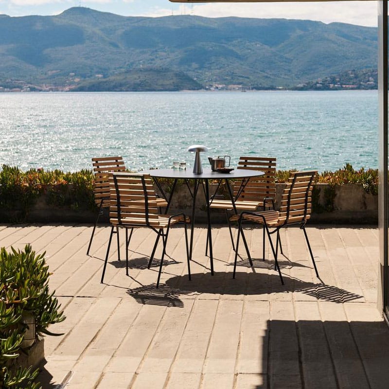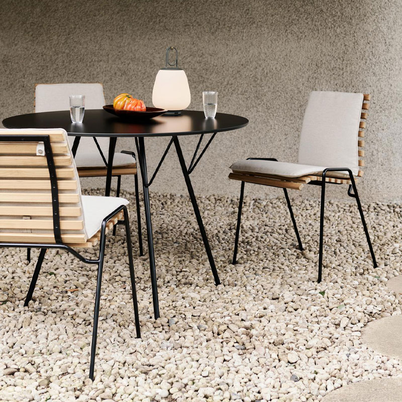 Terrace spisebord 97 fra &Tradition er en del av Robin Days Royal Festival Hall-kolleksjon. Bordet er laget i svart pulverlakkert stål som gjør det slitesterkt, værbestandig og robust. De lett skrå bena gir et mykt, industrielt uttrykk som passer perfekt ute.