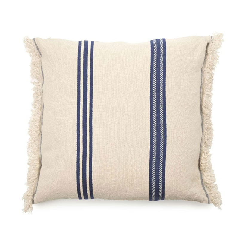 The Indigo Stripe Pute fra belgiske Libeco er laget i 100 % lin og leveres med dunpute inkludert. Puten har en off-white base med blå striper og frynser på endene.