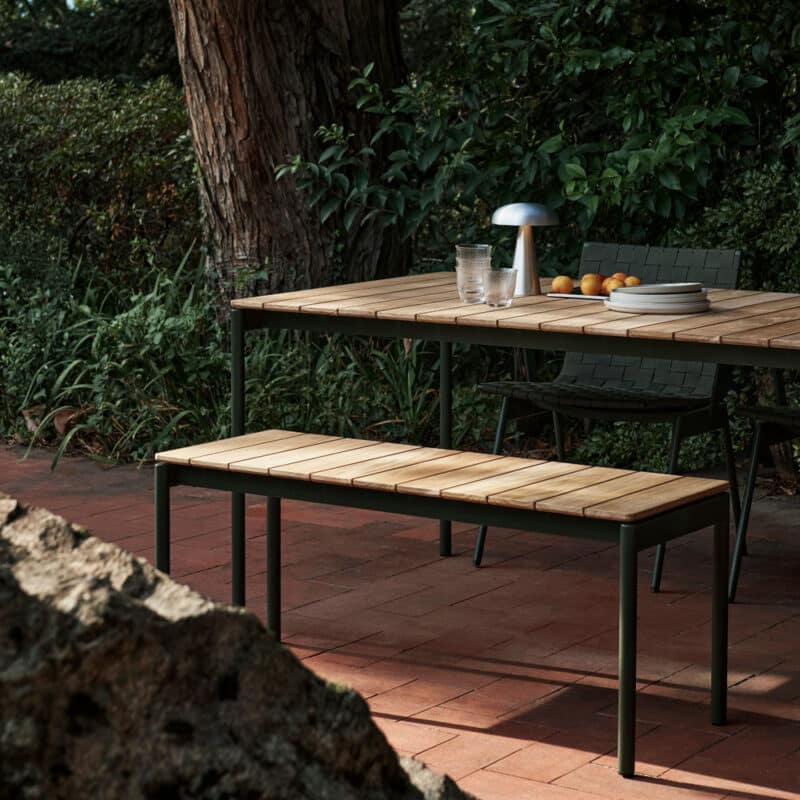 Ville Spisebord fra &Tradition er designet av den norske designduoen Anderssen & Voll og er en del av Ville-kolleksjonen – en serie utemøbler som kombinerer elegant design med høy funksjonalitet. Bordet er laget av pulverlakkert stål og teak, noe som gir det en robust og værbestandig konstruksjon, ideell for utendørs bruk.