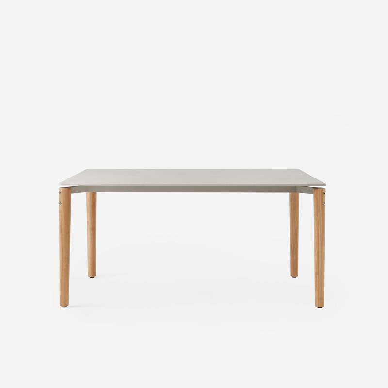 Vipp 718 | Open-Air spisebord 157 er et slitesterkt utebord med moderne uttrykk. Bordet har en solid ramme i pulverlakkert aluminium, en slitesterk keramisk bordplate og elegante koniske ben i teak, utviklet for holdbar bruk utendørs.